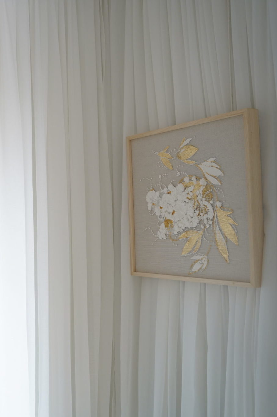 Matière minérale et or dorure à la feuille de cuivre sur tulle
